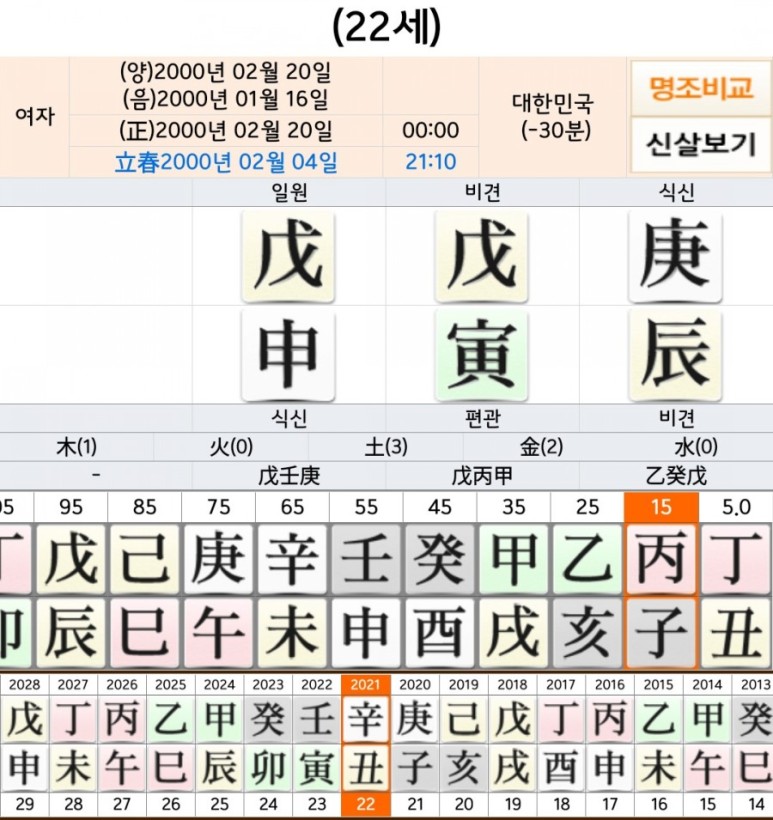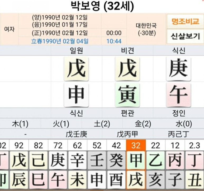 ▣ 해석 : 丙甲은 있고 癸水 정재가 부족하면 칠살,편인으로 준비하고 노력하는 것까지는 순조로울 수 있겠으나, 돈을 벌고 결과를 보는 입장에선 어려움이 따를 수 있다는 뜻이다.