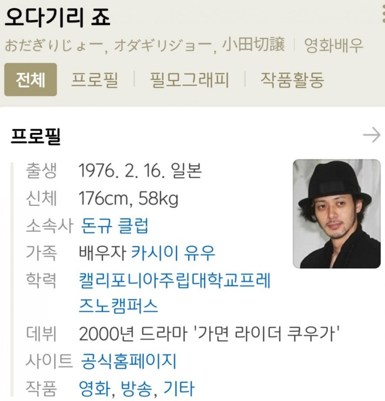 일본 의 배우 . 한자 이름보다는 オダギリジョー라는 가타카나 이름이 더 자주 쓰인다. 이건 이름인 譲가 평범하